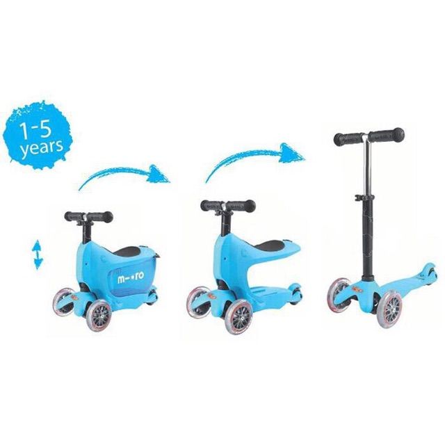 dimulai dari pakai kursi, lalu kursi bisa dilepas tinggi pegangan scooter juga bisa disesuaikan dengan tinggi anak