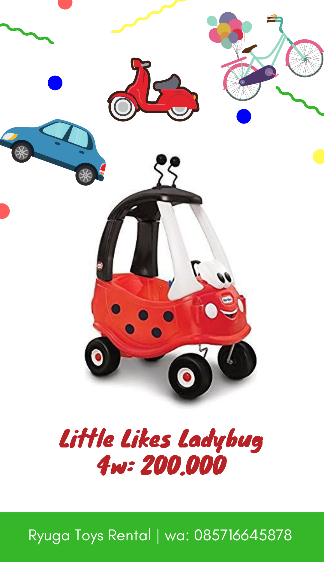 mainan mobilan dari little tikes dengan tema lady bug ini bisa dimainkan di dalam rumah atau diluar rumah (aspal halus)